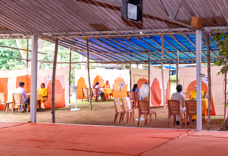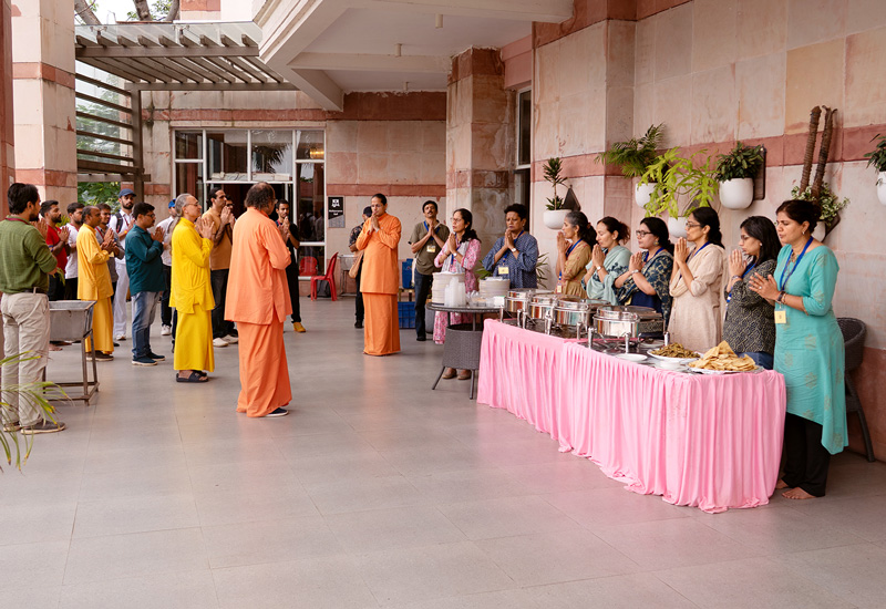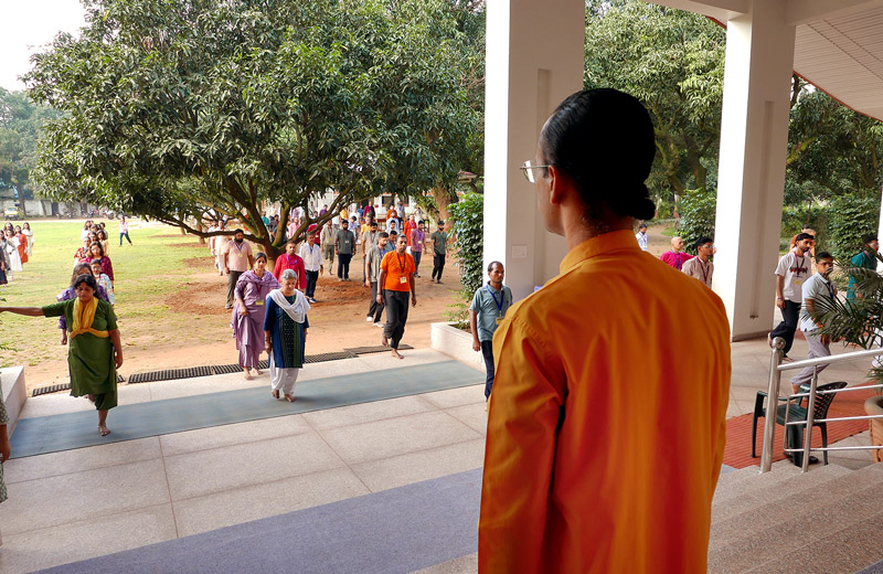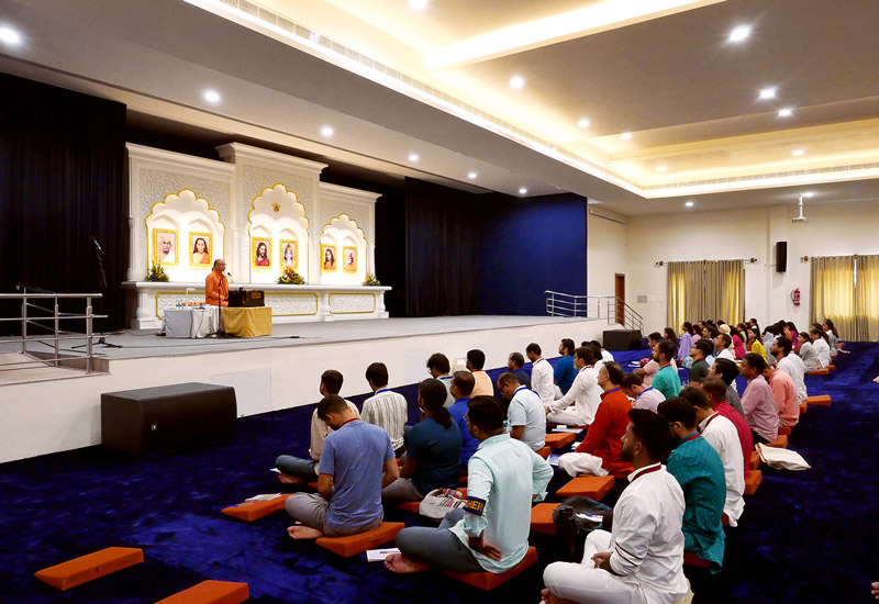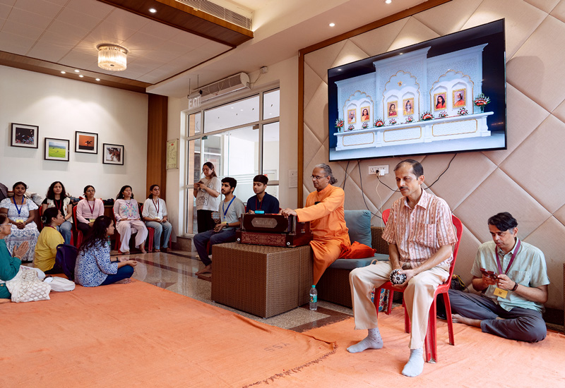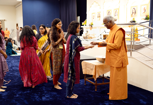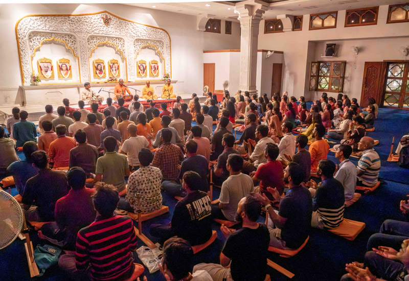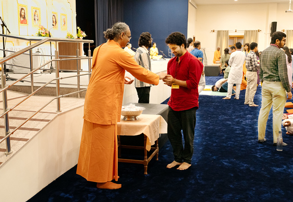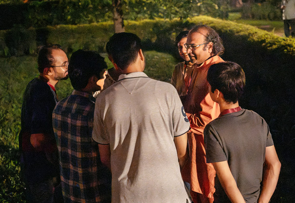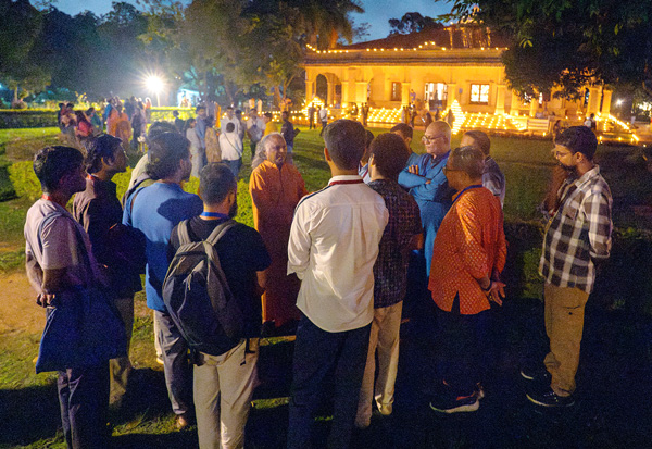 On the penultimate evening, a special kirtan meditation was organized as the highlight of the sangam. As the young sadhaks came out of the Dhyana Mandir, the ashram grounds glowed with thousands of lamps. The Open House that followed gave young sadhaks the opportunity to engage and interact with the sannyasis in the divine atmosphere of the illuminated ashram.