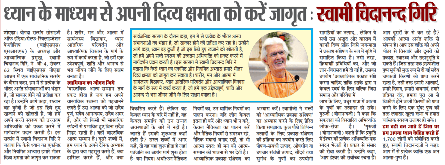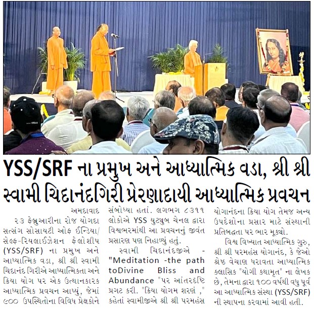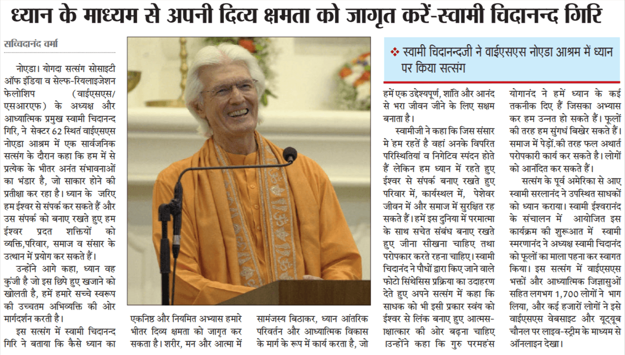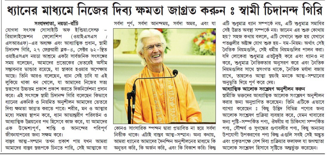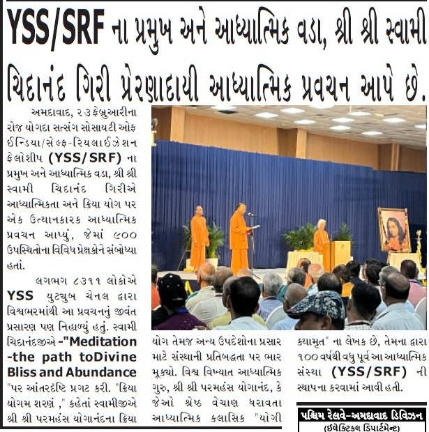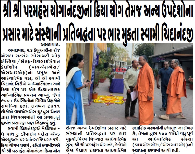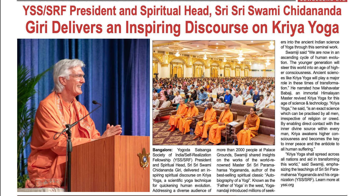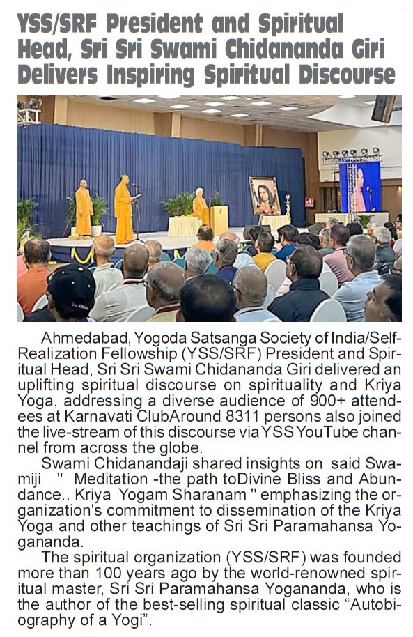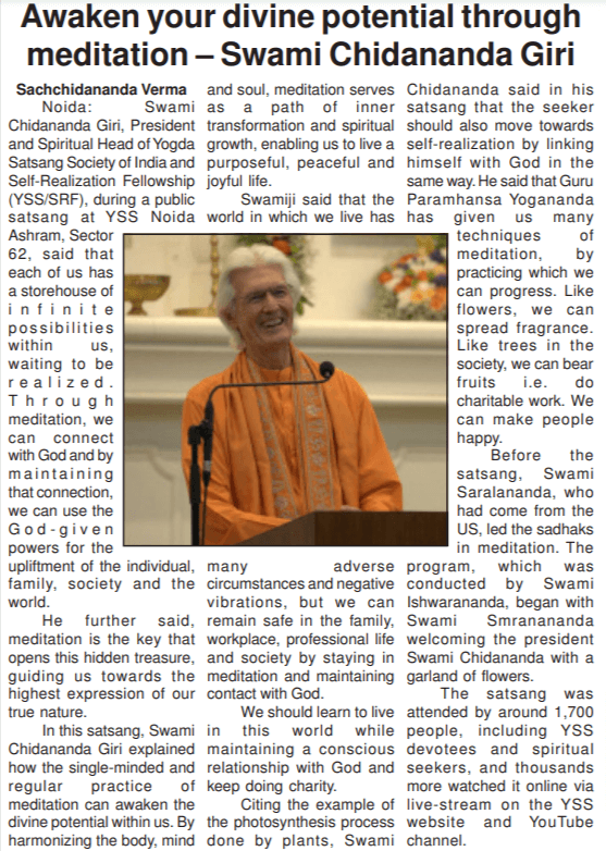Sri Sri Swami Chidananda Giri, president and spiritual head of Yogoda Satsanga Society of India/Self-Realization Fellowship (YSS/SRF) toured four major cities in India (Bengaluru, Chennai, Ahmedabad, and Noida) and Kathmandu in Nepal, where special one-day programmes were organized.