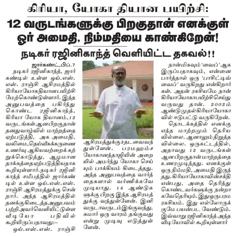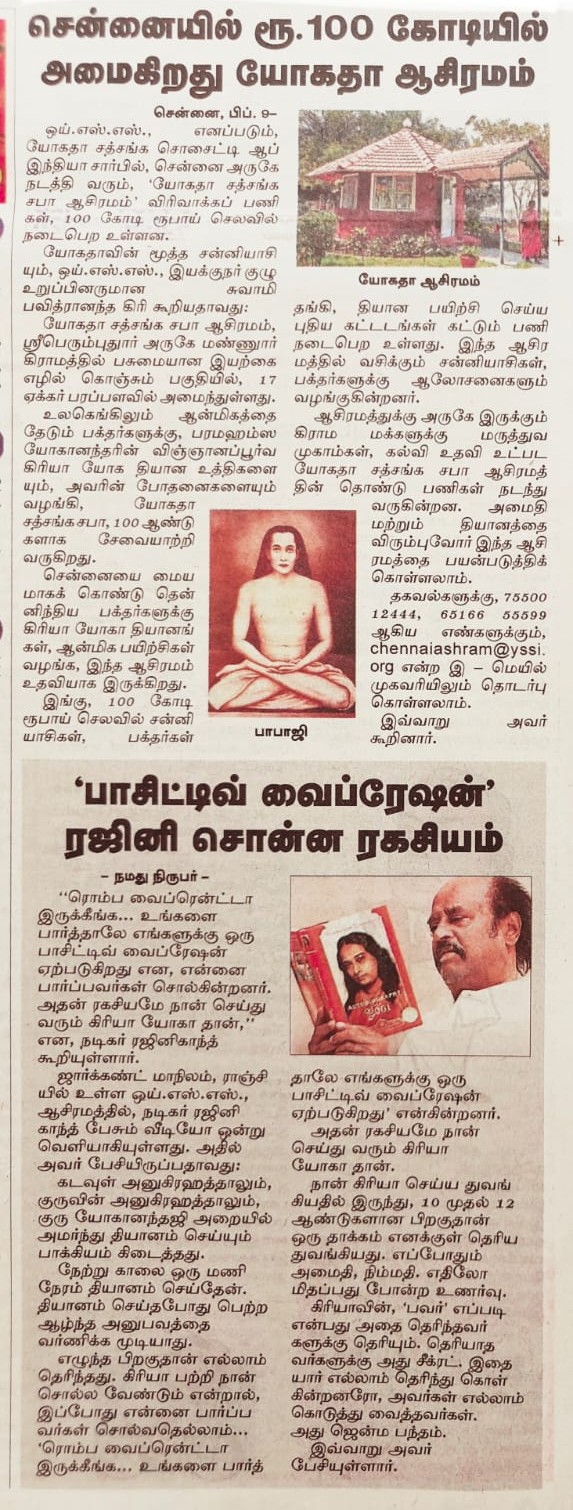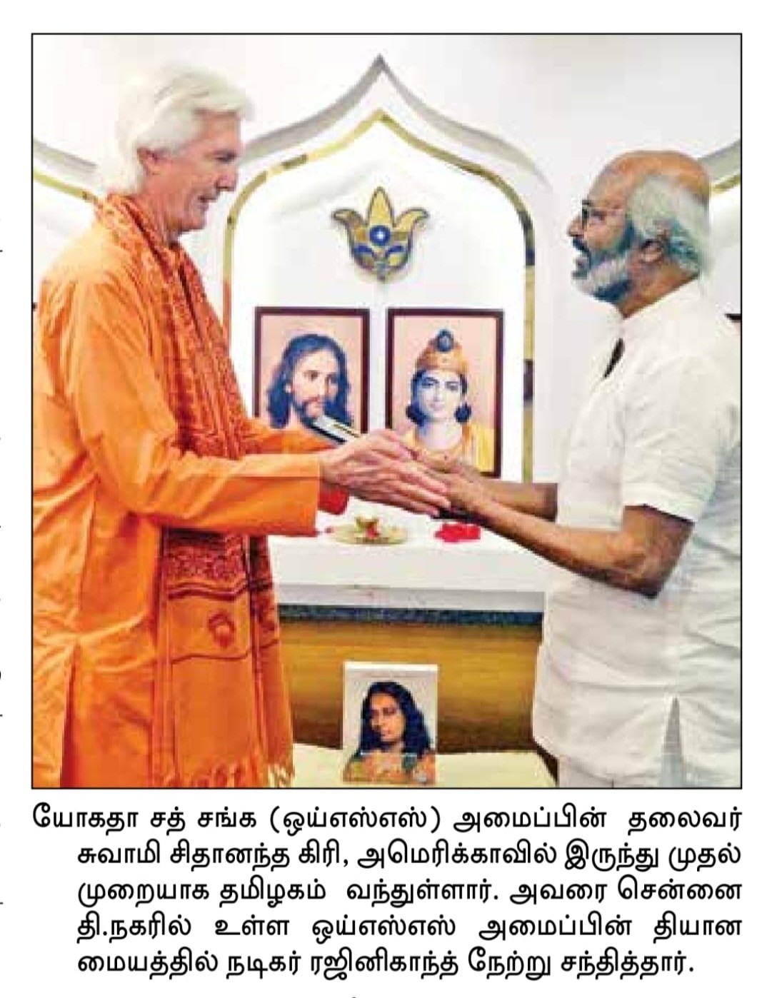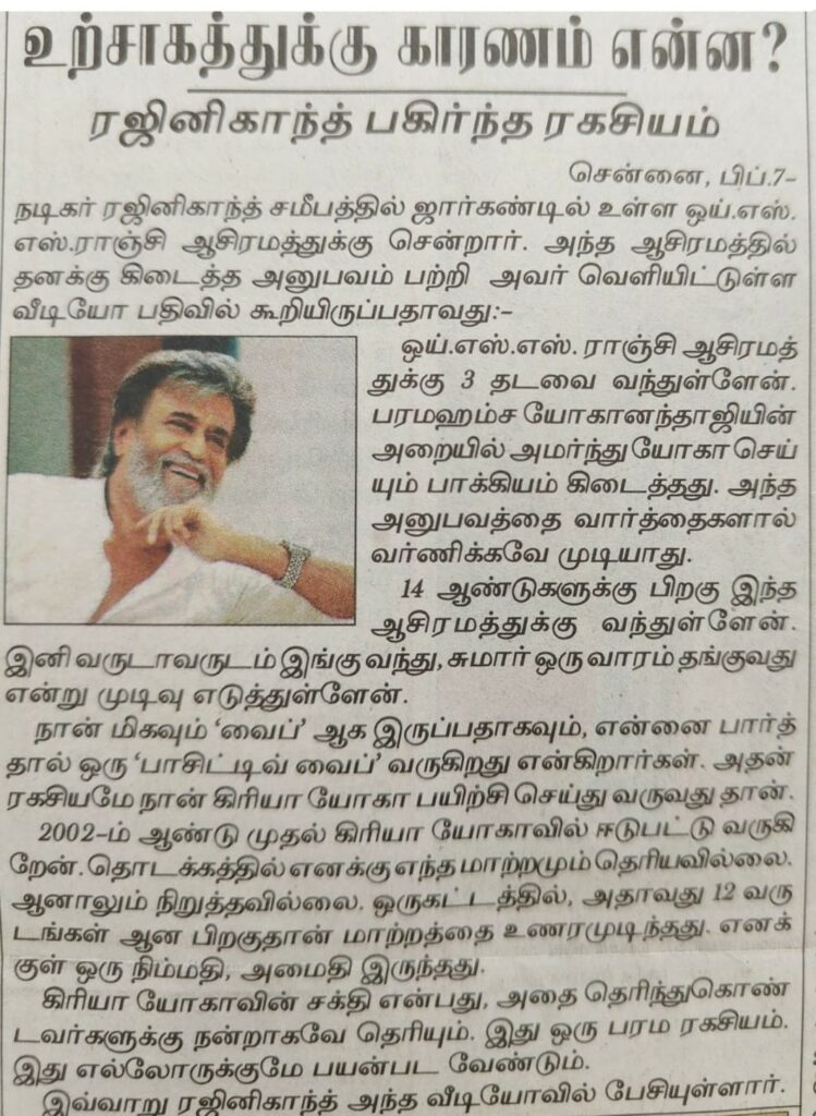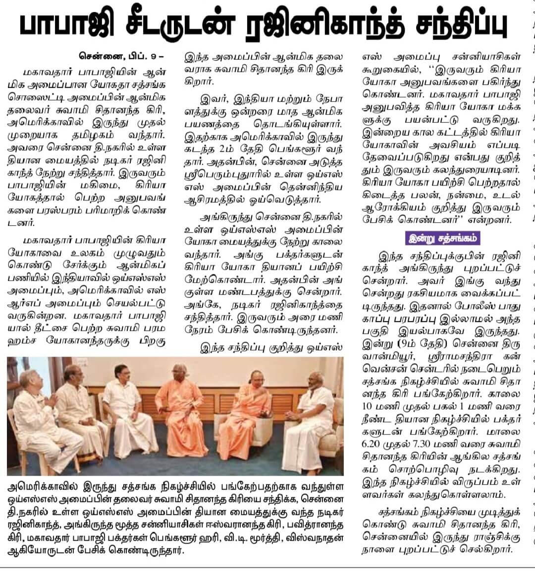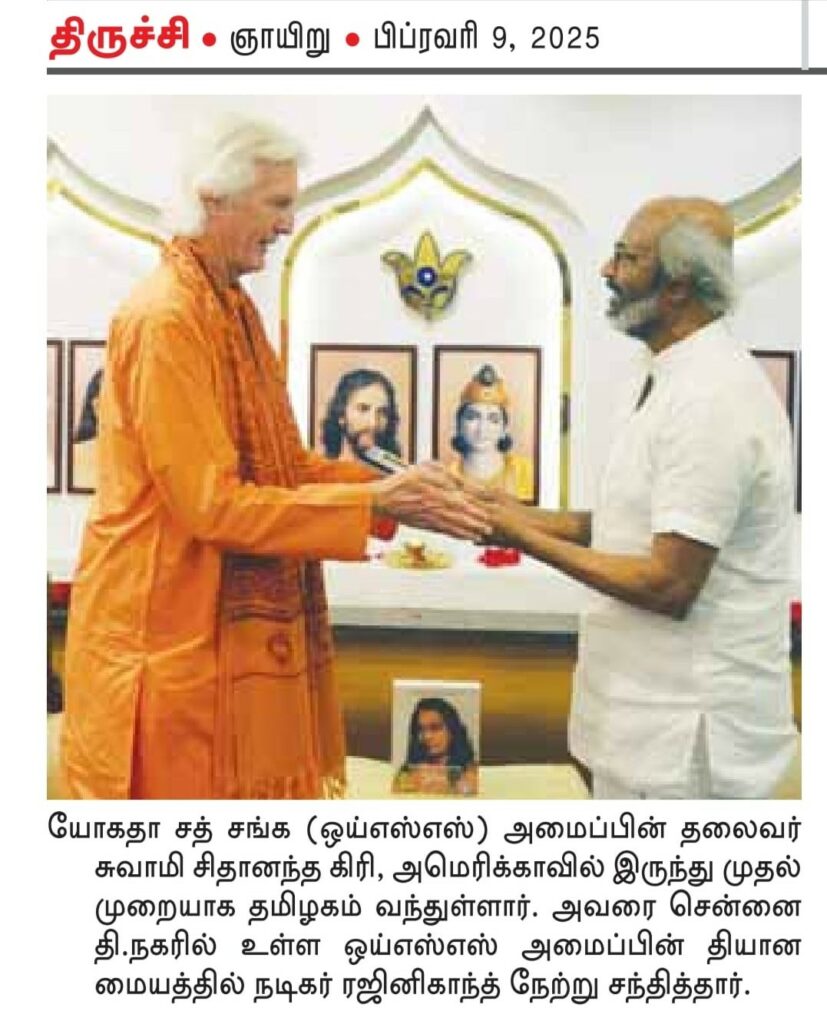 On February 8, Swami Chidanandaji met with the renowned Indian actor and Padma Vibhushan award recipient Sri Rajinikanth, who has been a devoted YSS devotee and Kriya Yoga practitioner for decades. Sri Rajinikanth was deeply inspired to meet Swamiji, the beloved leader of the spiritual organization founded by Paramahansa Yogananda. Swamiji and Sri Rajinikanth had a very friendly exchange, based on their mutual devotion to their Guru and his liberating path of Kriya Yoga.