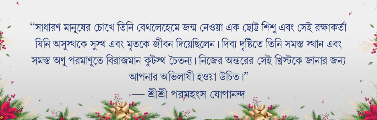 আমরা কি করে সক্রিয়ভাবে মানবজাতির জন্য মহান খ্রিষ্টমাসের এই উপহারের অংশ হতে পারি? জিশুখ্রিস্ট যেভাবে বলেছিলেন, আমাদের সত্ত্বা দিয়ে খ্রিস্ট চৈতন্যের সেই দয়া ও প্রেমের ভাবকে আত্মভূত করে, সেই নম্রতা দিয়ে যেখানে জগতের স্বীকৃতি বা স্বতন্ত্র আত্মকেন্দ্রিকতার কোনো প্রয়োজন বোধ থাকে না এবং সর্বদোষ ক্ষমাকারী সেই প্রেম দিয়ে, যার জন্যে সবচেয়ে কঠিন পরীক্ষার মধ্যেও তাঁর অন্তরকে কোনো শত্রুভাব স্পর্শ করতে পারেনি। পরমহংসজি আমাদের যেমন শিখিয়েছেন ধ্যানের আত্মস্থিত নিশ্চলতার মধ্যে ঈশ্বরের সঙ্গে যুক্ত থেকে আমরা গভীরতম ভাবে প্রেমের, আলোর এবং অন্তহীনতার প্রসারিত চেতনা অনুভব করতে পারি যা হল আসল খ্রিস্টমাস এবং তাকে আমাদের বাহ্যিক জীবনে প্লাবিত হতে দিতে পারি।