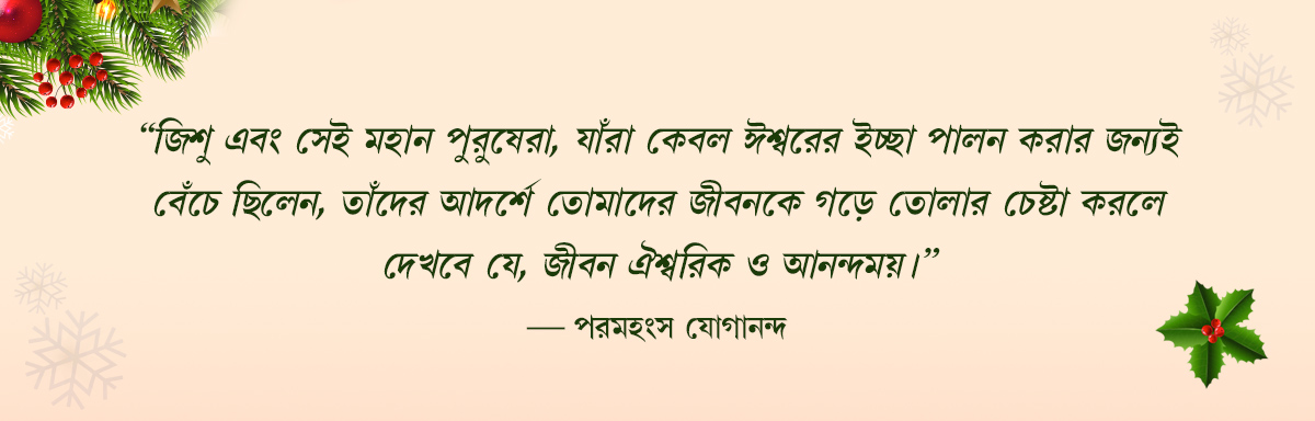 পরমহংস যোগানন্দের বিশ্বব্যাপী আধ্যাত্মিক পরিবার এবং তোমাদের বন্ধুদের সকলকে জানাই উষ্ণ, প্রেমময় এবং আনন্দময় খ্রিস্টমাস-এর শুভেচ্ছা! এই পবিত্র ঋতুতে প্রভু জিশু খ্রিস্টের জন্মোৎসবে আমি প্রার্থনা করি, যাতে তোমাদের ধ্যানের নীরবতায় তোমরা এই প্রিয় অবতারের সীমাহীন খ্রিস্ট-প্রেমকে আরও গভীরভাবে উপলব্ধি করতে পার, যা সমগ্র বিশ্ব-পরিবারকে আশীর্বাদপূত এবং আধ্যাত্মিক করে তোলে।