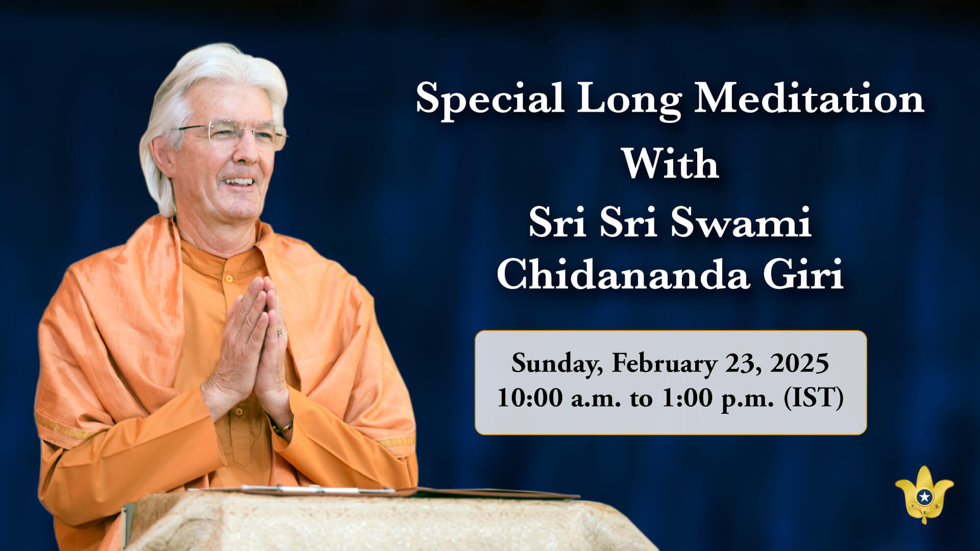 স্বামী চিদানন্দজি ভারত ও বিশ্বে ওয়াইএসএস /এসআরএফ-এর ভক্তবৃন্দ ও বন্ধুদের ধ্যানের মাধ্যমে শান্তি ও আনন্দের অভিজ্ঞতা লাভের নির্দেশনা দেবেন, যা পরমহংস যোগানন্দজির শিক্ষার সারকথা।