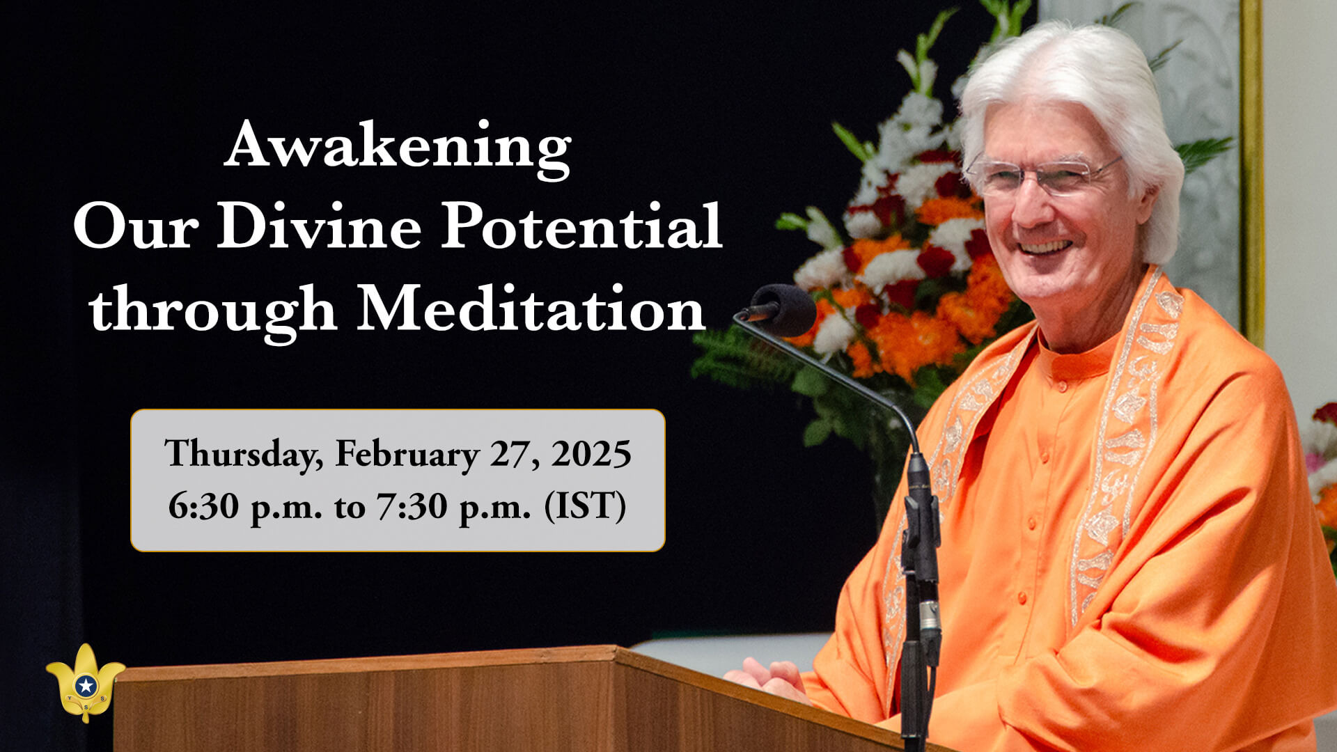 এই বক্তৃতায়, যোগদা সৎসঙ্গ সোসাইটি অফ ইন্ডিয়া/সেল্ফ-রিয়লাইজেশন ফেলোশিপ-এর অধ্যক্ষ এবং আধ্যাত্মিক প্রধান শ্রীশ্রী স্বামী চিদানন্দ গিরি আন্তরিক এবং নিয়মিত ধ্যান অভ্যাসের দ্বারা কেমন করে নিজের অন্তরের দিব্য সম্ভাবনাকে জাগ্রত করা যায় সে বিষয়ে অন্বেষণ করবেন। দেহ, মন এবং আত্মার সমন্বয় সাধনের মাধ্যমে ধ্যান অন্তরের রূপান্তর এবং আধ্যাত্মিক উন্নতির এক পথ হিসেবে কাজ করে , আপনাদের উদ্দেশ্যপূর্ণ, শান্তি এবং আনন্দময় এক জীবনযাপনের ক্ষমতা প্রদান করে।