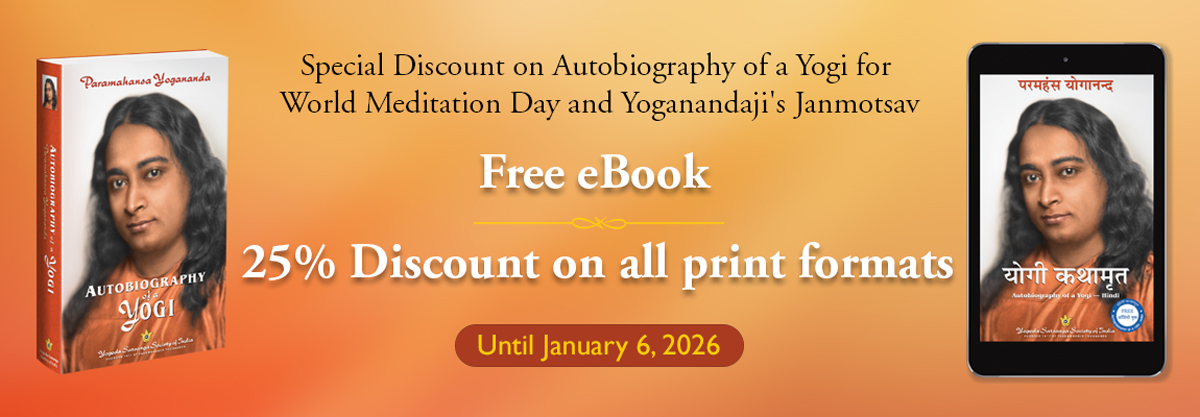 On the occasion of World Meditation Day and Paramahansa Yogananda’s Janmotsav – falling on December 20 and January 5 respectively, YSS is offering a 25% discount on all print formats and free eBook of the spiritual classic Autobiography of a Yogi. Please click the links below to avail this offer.