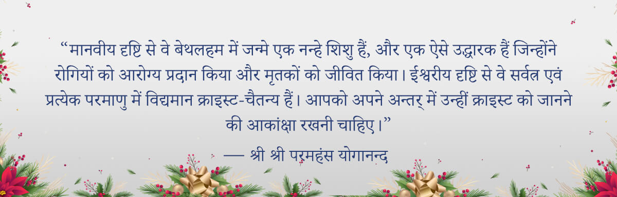 एक बार गुरुदेव ने कहा था, “हम जीसस को पालने में लेटे हुए एक असहाय शिशु के रूप में देखते है…परन्तु उस नन्हे स्वरूप में वे अनन्त क्राइस्ट, ब्रह्माण्ड का प्रकाश थे।” सृष्टि के प्रत्येक परमाणु में धड़कने वाले उस सर्वव्यापी क्राइस्ट-चैतन्य [कूटस्थ चैतन्य] में हमारे जीवन को प्रकाशित करने और संसार को आरोग्य प्रदान करने की शक्ति विद्यमान है।