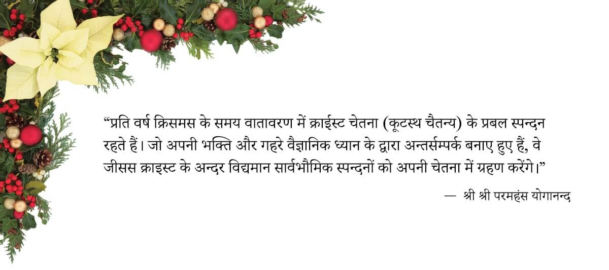 क्रिसमस के इस पावन अवसर पर सम्पूर्ण जगत अनंत क्राइस्ट के समस्त सृष्टि में व्याप्त उज्जवल प्रेम और आनन्द से वास्तविक रूप से धन्य हुआ है। मैं प्रार्थना करती हूँ कि यह आपके जीवन को नवीन आशा, एवं ईश्वर की अच्छाई और प्रेम की शक्ति में आस्था से रोशन कर दे, जो सदैव ग्रहणशील हृदयों पर अपना उत्थानात्मक, सामंजस्यपूर्ण प्रभाव डालती है। जीसस, जिनमें विश्वव्यापी क्राइस्ट चेतना [कूटस्थ चैतन्य] पूर्ण रूप से प्रकट हुई थी, के जन्मदिवस पर मनाया जाने वाला हमारा यह आनन्दोत्सव हम सब में यह अनुभूति जागृत करे कि हम भी ईश्वर के प्रकाश से उत्पन्न हुए हैं और इस संसार में उनकी असीम चेतना एवं प्रेम की शक्ति को प्रतिबिंबित करने की क्षमता से संपन्न हैं।