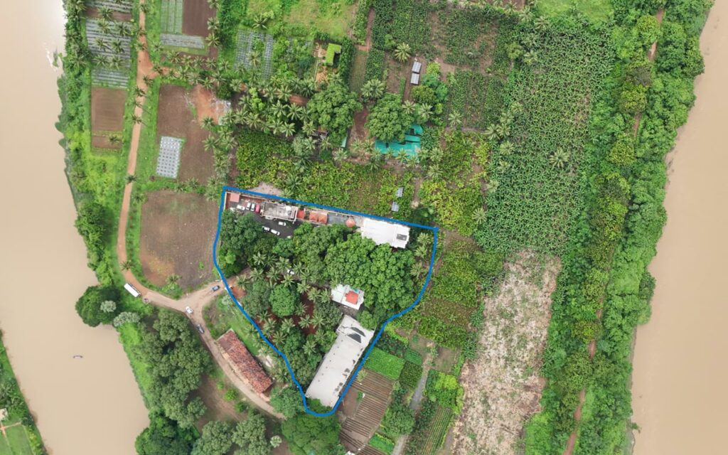 राजमुंदरी, आंध्र प्रदेश में 24 अगस्त, 2024 को एक नए योगदा सत्संग साधनालय का उद्घाटन हुआ। 1.35 एकड़ क्षेत्र में फैला यह साधनालय एक हरे-भरे द्वीप पर स्थित है, जो एक ओर पवित्र गोदावरी नदी और दूसरी ओर उसकी सिंचाई नहर से घिरा हुआ है। (नीचे : ड्रोन शॉट में नीले रंग में चिह्नित परिसर, दोनों ओर नदी के साथ)