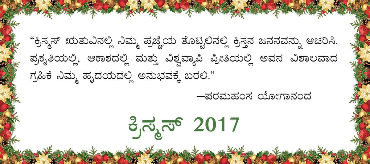 ಪವಿತ್ರ ಕ್ರಿಸ್ಮಸ್ ಋತುವಿನ ಬೆಳಕು ಮತ್ತು ಆನಂದಗಳು ಭಗವತ್ಪ್ರೇಮದ ನವೀಕೃತ ಅರಿವಿನಿಂದ, ಹಾಗೂ ನಿಮ್ಮ ಜೀವನದಲ್ಲಿ ಮತ್ತು ಜಗತ್ತಿನಲ್ಲಿ ಅದರ ರೂಪಾಂತರಗೊಳಿಸುವ ಮತ್ತು ಸಮನ್ವಯಗೊಳಿಸುವ ಶಕ್ತಿಯಲ್ಲಿರುವ ವಿಶ್ವಾಸದಿಂದ ನಿಮ್ಮ ಹೃದಯವನ್ನು ಉನ್ನತೀಕರಿಸಲಿ. ಪ್ರೀತಿಯ ಪ್ರಭು ಯೇಸು ಉದಾಹರಿಸಿದ ದೈವಿಕ ಗುಣಗಳಿಗೆ ನಮ್ಮ ಹೃದಯವನ್ನು ತೆರೆಯಲು ವಿಶೇಷ ಪ್ರಯತ್ನವನ್ನು ಮಾಡುವ ಮೂಲಕ ಮತ್ತು ವಿಶೇಷವಾಗಿ ನಮ್ಮ ಗುರು ಪರಮಹಂಸ ಯೋಗಾನಂದರು ಒತ್ತಾಯಿಸಿದಂತೆ, ನಮ್ಮ ಪ್ರಜ್ಞೆಯಲ್ಲಿ ಸರ್ವವ್ಯಾಪಿ ಭಗವತ್ಪ್ರೇಮ ಮತ್ತು ಬೆಳಕನ್ನು ಸ್ವೀಕರಿಸಲು, ಆಳವಾಗಿ ಧ್ಯಾನಿಸುವ ಮೂಲಕ ಈ ಬಾಹ್ಯ ಹಬ್ಬದ ಸಮಯದಲ್ಲಿ ಆಂತರಿಕ, ಪವಿತ್ರ ಆಯಾಮವನ್ನು ನಾವು ಪ್ರತಿಯೊಬ್ಬರೂ ಸ್ಪಷ್ಟವಾಗಿ ಅನುಭವಿಸಬಹುದು. ಈ ಪವಿತ್ರ ಋತುವಿನಲ್ಲಿ ನಾವು ಈ ಜಗತ್ತಿನಲ್ಲಿ ಎಲ್ಲೇ ಇದ್ದರೂ, ಆ ಪ್ರಯತ್ನದಲ್ಲಿ ನಮ್ಮ ಭಕ್ತಿಯನ್ನು ಒಂದುಗೂಡಿಸುವ ಮೂಲಕ ನಾವು ಕ್ರಿಸ್ಮಸ್ನ ನಿಜವಾದ ಅನುಗ್ರಹವನ್ನು ಪೂರ್ಣರೀತಿಯಲ್ಲಿ ಪಡೆಯುತ್ತೇವೆ.