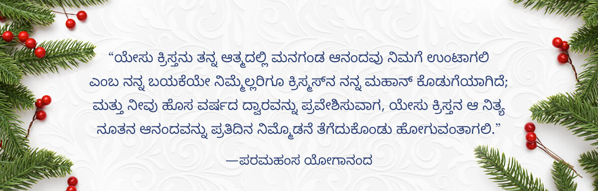 ನಮ್ಮ ಗುರುಗಳು ಕೊಂಡಾಡಿದ ಕ್ರಿಸ್ಮಸ್ನ ಈ ನಿಜವಾದ ಸಂಭ್ರಮಾಚರಣೆಯು ನಮಗೆ ಎದುರಾಗುವ ಎಲ್ಲ ಸವಾಲುಗಳನ್ನು ಧೈರ್ಯದಿಂದ ಎದುರಿಸಲು ಮತ್ತು ಆಂತರಿಕವಾಗಿ ಜಯ ಸಾಧಿಸಲು ನಮಗೆ ಶಕ್ತಿಯನ್ನು ನೀಡುತ್ತದೆ. ಕ್ರಿಯಾ ಯೋಗದ ದಿವ್ಯ ಉಡುಗೊರೆಯಡಿಯಲ್ಲಿ ಆಶ್ರಯ ತೆಗೆದುಕೊಳ್ಳುವುದರಿಂದ, ಸಮಯ ಸರಿದಂತೆ ನಮಗಾಗಿ, ನಮ್ಮ ಪ್ರೀತಿಪಾತ್ರರಿಗಾಗಿ ಮತ್ತು ನಮ್ಮ ಪ್ರಪಂಚಕ್ಕಾಗಿ ದೈವಿಕ ಬೆಂಬಲದ ಪ್ರಜ್ಞೆಯನ್ನು ದೃಢವಾಗಿ ಹಿಡಿದಿಟ್ಟುಕೊಳ್ಳುವ ನಮ್ಮ ಸಾಮರ್ಥ್ಯವು ವೃದ್ಧಿಸುತ್ತದೆ; ಮತ್ತು ಕ್ರಮೇಣವಾಗಿ ನಾವು ಎಂದೂ ನಮ್ಮ ದಿವ್ಯ ದಾತನ ಸಂರಕ್ಷಣೆಯ ತೇಜೋಮಂಡಲದ ಆಚೆಗಿರಲಿಲ್ಲ ಎಂಬ ಒಂದು ಅಂತರ್ಬೋಧಿತ ಶಕ್ತಿಯ ನಿಶ್ಚಿತವಾದ ವಿಶ್ವಾಸವನ್ನು ಗಳಿಸುತ್ತೇವೆ. ನಿಮಗೆ ನನ್ನ ಪ್ರಾರ್ಥನೆಯೇನೆಂದರೆ, ನಿಮ್ಮ ಹೃದಯ ಮತ್ತು ಮನೆಯು ಈ ಕ್ರಿಸ್ಮಸ್ನಂದು ಮತ್ತು ಸದಾ, ಕ್ರಿಸ್ತಾನಂದದಿಂದ ತುಂಬಿರಲಿ–ಭಗವಂತ, ಯೇಸು ಕ್ರಿಸ್ತ ಮತ್ತು ಗುರುಗಳೆಲ್ಲರಿಂದ ನಿರಂತರವಾಗಿ ಹರಿಯುವ ನಿರುಪಾಧಿಕ ಪ್ರೇಮ ಮತ್ತು ನಿರಂತರ ಶಾಂತಿಯ ಉದ್ಧರಿಸುವ ಕಂಪನಗಳೊಂದಿಗೆ.