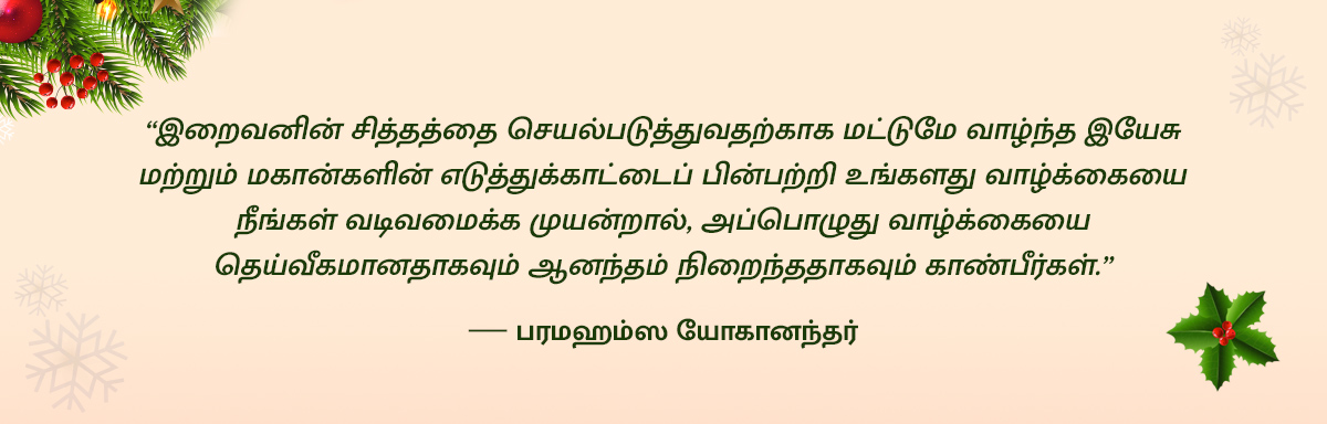 உங்களுக்கும், உலகம் முழுவதும் உள்ள பரமஹம்ஸ யோகானந்தருடைய எல்லா ஆன்மீகக் குடும்பத்தினர் மற்றும் நண்பர்களுக்கும் அன்பான, மனமார்ந்த, மகிழ்ச்சியான கிறிஸ்துமஸ் வாழ்த்துகள்! இந்தப் புனிதப் பருவத்தில் கர்த்தர் இயேசு கிறிஸ்துவின் பிறப்பை நாம் கொண்டாடும்போது, உங்களது தியானத்தின் அமைதியில் அன்பிற்குரிய இந்தத் திருஅவதாரத்தின் எல்லையற்ற கிறிஸ்து-அன்பை — உலகக் குடும்பம் முழுவதையும் தொடர்ந்து ஆசீர்வதித்து, ஆன்மீகமயமாக்கும் அன்பை — இன்னும் அதிகமாக ஆழ்ந்து உணர நான் பிரார்த்திக்கிறேன்.